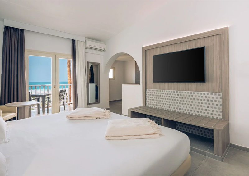 La struttura dispone di 276 camere distribuite in vari edifici di uno e due piani. Tutte dispongono di servizi privati con doccia, asciugacapelli, aria condizionata, telefono, TV satellitare, Wi-Fi, cassetta di sicurezza, minifrigo, balcone o terrazzo. Si distinguono in camere classic (27 m2) con una massima occupazione di 3 adulti; classic plus che hanno i seguenti servizi inclusi: check in prioritario, late check out, prima fornitura minibar inclusa (2 bottiglie: acqua naturale, acqua frizzante, cola, aranciata, birra, 2 barrette di cioccolato e una confezione di patatine), con supplemento sono disponibili camere vista mare parziale e vista mare. Per il massimo relax è possibile prenotare le superior vista mare (28 m2, massima occupazione 3 adulti) che dispongono di terrazzo leggermente più spazioso con sdraio a disposizione. Per una vacanza in famiglia sono perfette le camere family (32 m2) composte da due ambienti separati e divano letto che possono ospitare fino a 3 adulti ed un bambino; le family vista mare (39 m2) e family superior vista mare (40 m2) con 2 sdraio a disposizione in terrazzo. I due ambienti sono separati da una parete sprovvista di porta. Inoltre, le suite (61 m2) che dispongono di due camere da letto e due bagni, offrono la vista mare e possono ospitare fino a 6 persone.